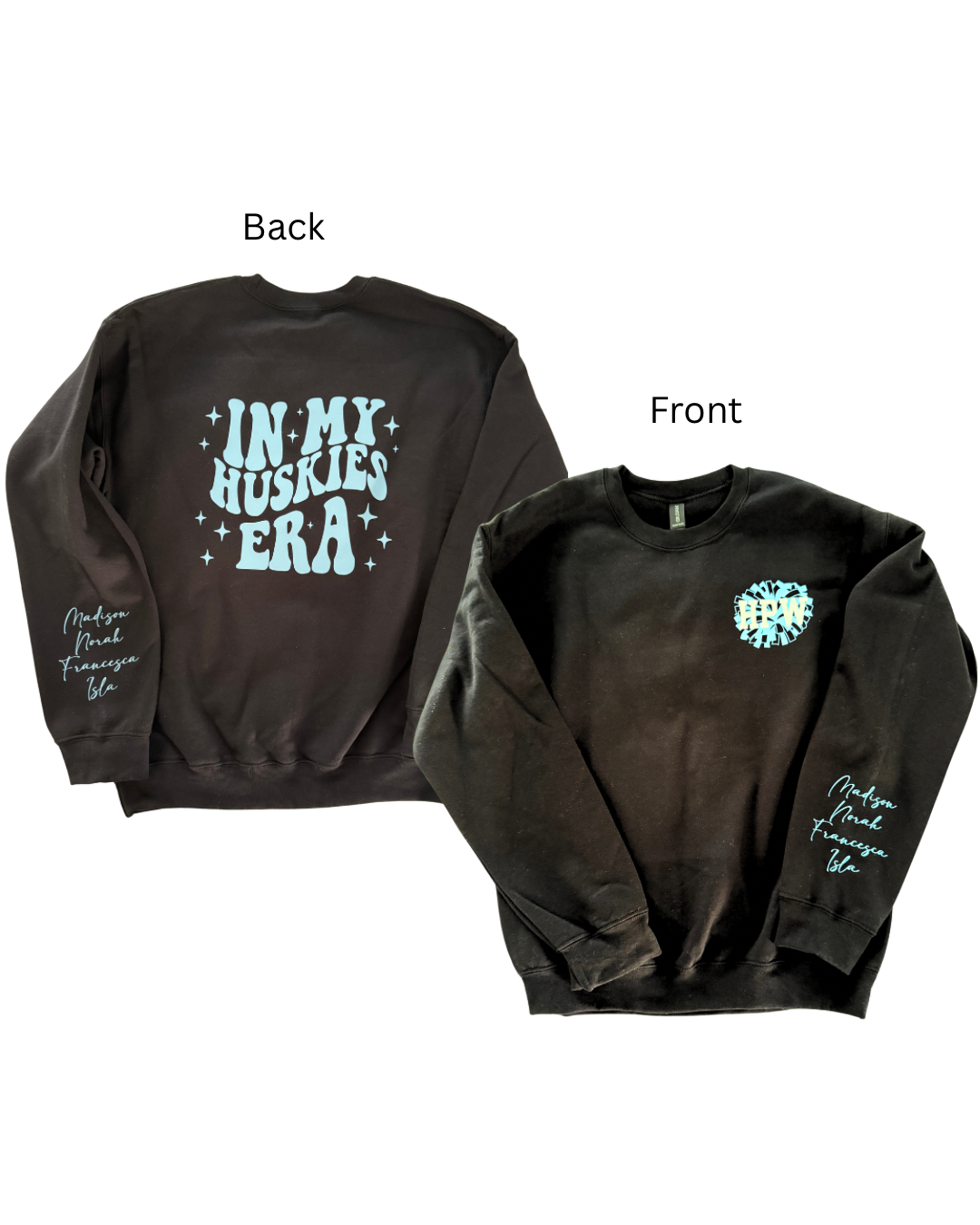 Crewneck sweatshirt. “In my Huskies era” on back with “HPW” on the front left with cheerleader(s) names on left sleeve.